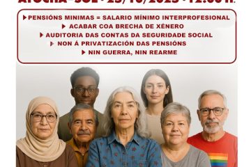 Achegamos o comunicado da Unidade de Acción pensionista (COESPE, EHPM (Euskal Herria) MADPP (Movimiento Andaluz), MODEPEN (Movemento Galego), UNIDADE COESPE, PLATAFORMAS DE PENSIONISTAS de Badajoz, Móstoles…) convocando unha nova manifestación o 25 de outubro co lema xeral de: Pola dignidade das pensións públicas, pensión mínima igual ao SMI xa!.