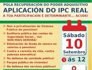 • Garantir por lei a suba das pensións e salarios acordes ao “IPC real”,e non co chamado “IPC Medio”, (a media dos IPC dos 12 meses do ano) pois esto supón rebaixar as pensións e reducir o poder adquisitivo dos pensionistas.
