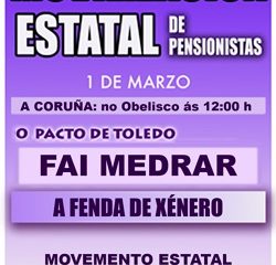 O día 1 de marzo, terán lugar mobilización de pensionistas no Obelisco, en Coruña. As mobilizacións están convocadas polo Movemento Estatal de Pensionistas (MEP), onde conflúen máis do 90% das plataformas de pensionistas do Reino de España.