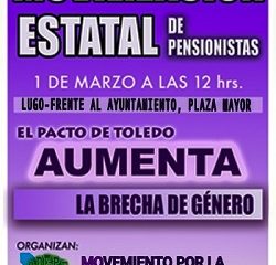 O día 1 de marzo, terán lugar mobilización de pensionistas na Praza Maior, fronte o Concello, en Lugo. As mobilizacións están convocadas polo Movemento Estatal de Pensionistas (MEP), onde conflúen máis do 90% das plataformas de pensionistas do Reino de España.