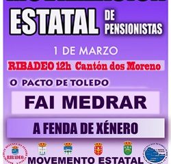 O día 1 de marzo, terán lugar mobilización de pensionistas no Cantón dos Morenos, en Ribadeo. As mobilizacións están convocadas polo Movemento Estatal de Pensionistas (MEP), onde conflúen máis do 90% das plataformas de pensionistas do Reino de España.