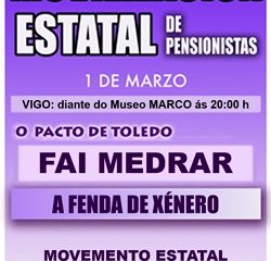 O día 1 de marzo, terán lugar mobilización de pensionistas diante do Museo MARCO, en Vigo. As mobilizacións están convocadas polo Movemento Estatal de Pensionistas (MEP), onde conflúen máis do 90% das plataformas de pensionistas do Reino de España.