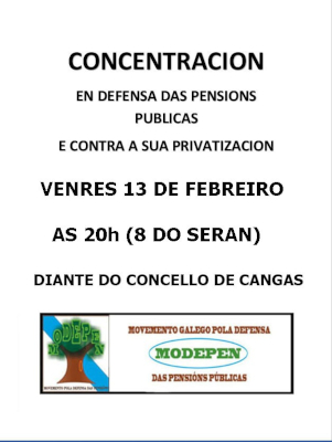 Cangas: Concentración na Defensa das Pensións Públicas e contra a sua Privatización, o día 13 de Febreiro, as 20:00 h. diante do Concello de Cangas. 3 Febreiro, 2026 modepen AXENDA Febreiro 13, 2026 | 8:00 pm Diante do Concello, Cangas, Galiza Compartir en:Share on X (Twitter)Share on FacebookShare on WhatsAppShare on Telegram