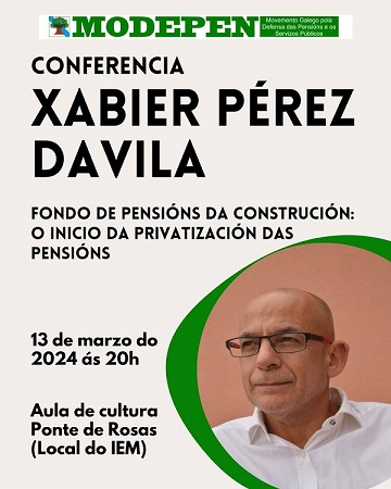 Modepen Minhor: Conferencia de Xabier Pérez Davila – Fondo de Pensións da Construcción: O inicio da privatización das Pensións 10 Marzo, 2024 modepen AXENDA Marzo 13, 2024 | 8:00 pm Aula de Cultura Ponte de Rosas (Local do IEM), Gondomar, Galiza Compartir en:Share on X (Twitter)Share on FacebookShare on WhatsAppShare on Telegram