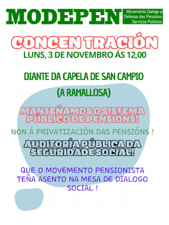 Val Miñor: Concentración o luns, 3 de Novembro, diante da Capela de San Campio (A Ramallosa). Manteñamos o Sistema Público de Pensións. Auditoría Pública da Seguridade Social.