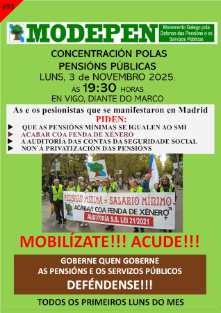 Vigo: Concentración diante do MARCO o día 3 de Novembro. Pensión Mínima = Salario Mínimo. MOBILÍZATE!!! ACUDE!!! 28 Outubro, 2025 modepen AXENDA Novembro 3, 2025 | 7:30 pm Diante do MARCO, na Rúa Príncipe, Vigo, Galiza Compartir en:Share on X (Twitter)Share on FacebookShare on WhatsAppShare on Telegram